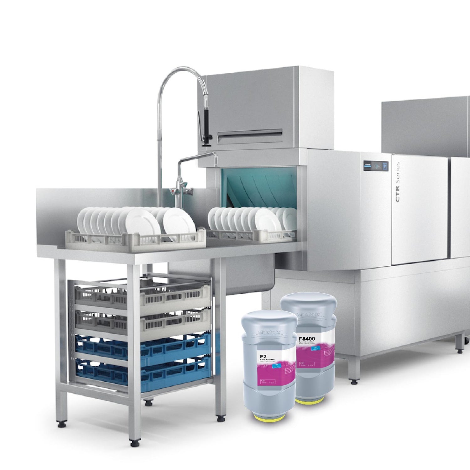 El polvo para maquina lavavajillas no requiere de contacto directo con el producto gracias a su sistema de dosificación automática. Se utiliza principalmente en equipos grandes como nuestros trenes de lavado CTR, MT o el lavautensilios Winterhalter de la serie UF. Posiblemente en un equipo lavavajillas de capota como nuestra PT, y definitivamente no posible de usar en equipos pequeños como los de bajo mostrador.
