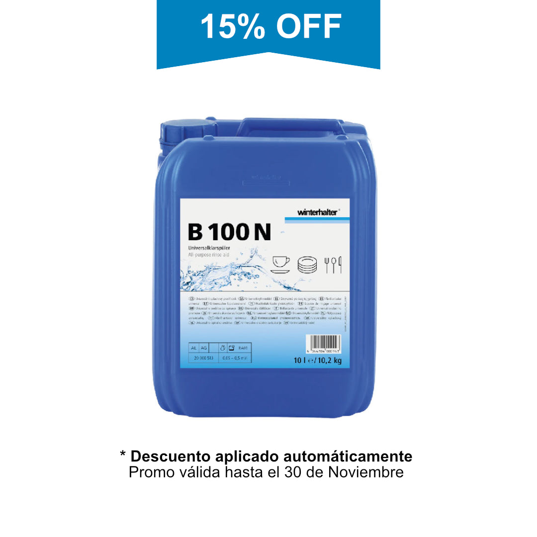 Abrillantador o secante neutro de uso universal, altamente concentrado y apto para todo tipo de aplicaciones. Puede usarse en cualquier lavavajillas de uso industrial, ya sea, de carga frontal, capota, lavautensilios o tren de lavado. Se recomienda especialmente el abrillantador B 100N para vajilla de cristal, porcelana, plástico, acero inoxidable, aluminio y plata. Otra ventaja de este producto, es que asegura un acabado brillante y está especialmente diseñado para garantizar la estabilidad de la espuma de cerveza. Producto sin stock actualmente.