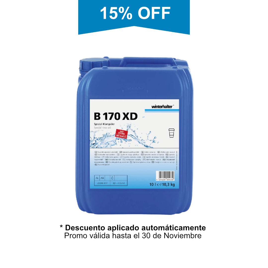Apto para todo tipo de máquinas de lavado profesional,  ya sea de carga frontal, capota, lavautensilios o tren de lavado. El abrillantador industrial B170 XD está diseñado especialmente para utensilios de plástico, vasos de plástico reutilizables y demás piezas de este material. Este producto se caracteriza por su excelente humidificación y por su capacidad de otorgar un brillo resplandeciente al material de lavado.